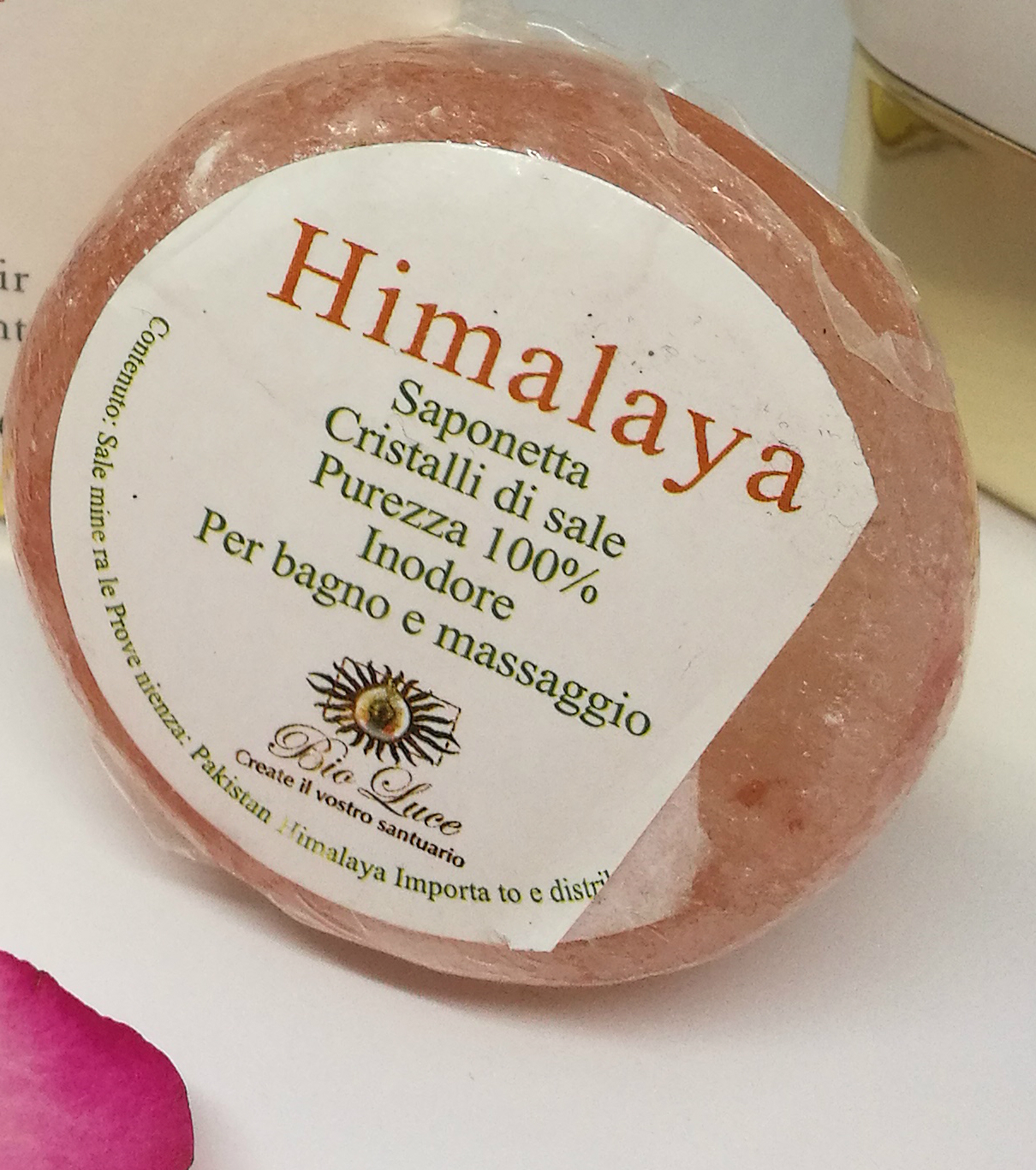 Himalaya Cristal ha la forma di una saponetta, ed è costituita da cristalli di sale puri al 100%. Completamente inodore, ha un’azione esfoliante e drenante. I granelli di sale sono piuttosto grossi, per cui vi consiglio di non strofinare in maniera troppo aggressiva e di utilizzarla solo su zone non troppo sensibili/delicate, per non rischiare di graffiarvi.